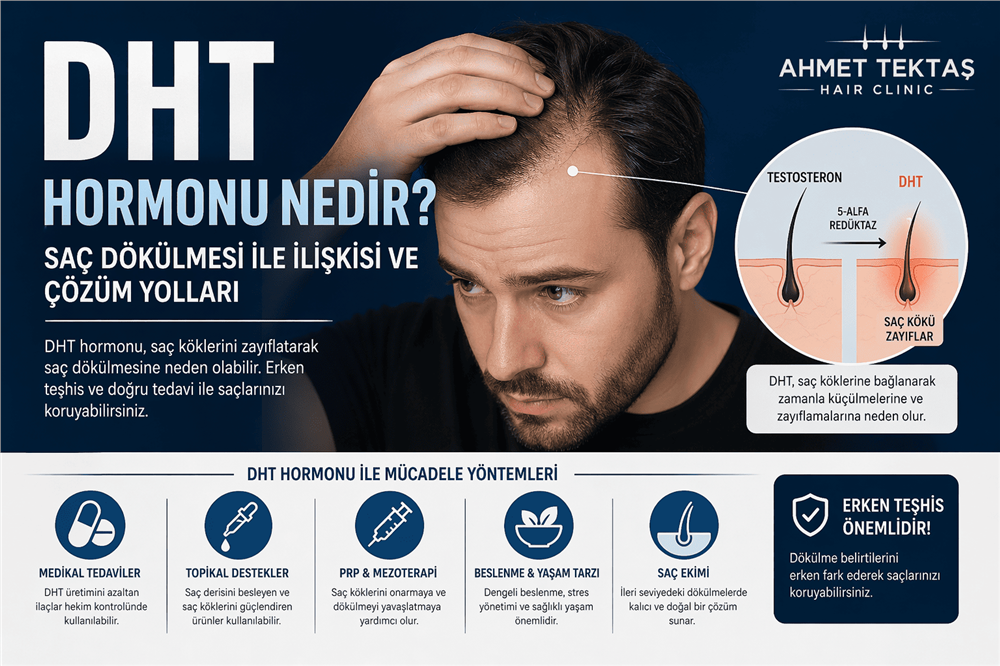 Bu kapsamlı rehberde; DHT hormonu nedir, saç dökülmesine nasıl sebep olur, kimlerde görülür, belirtileri nelerdir, nasıl engellenebilir ve hangi tedaviler uygulanabilir gibi tüm merak edilen konuları detaylı şekilde ele alıyoruz.